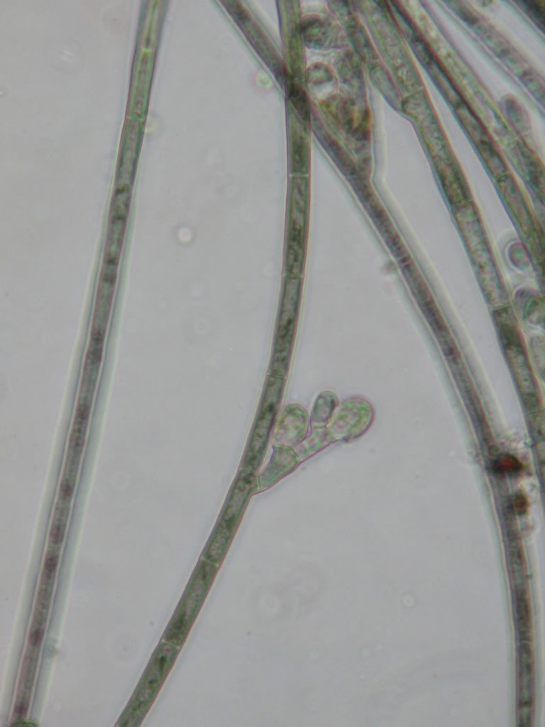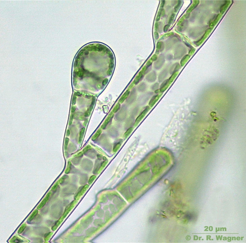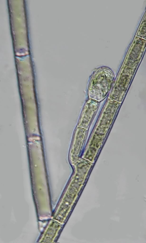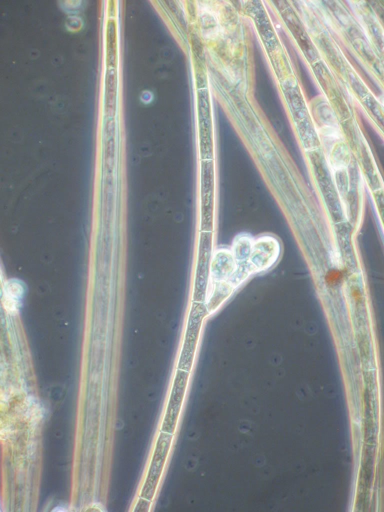 Nun habe ich in meinen Aquarien ein Algenproblem. Ich denke, daß es Blaualgen der Gattung Rivularia, eventuell biasolettiana sind. Bei der Bestimmung würde ich mich über Eure Hile freuen. Hier ein Bild, aufgenommen mit Leitz EF 63fach, aus 5 Bildern mit Picolay gestackt. Die Zellen haben eine Länge von ca. 4 um: