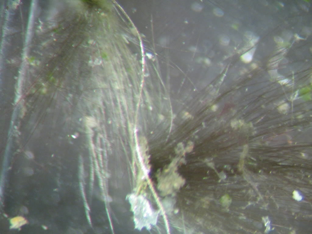 da ich mich noch nicht so gut auskenne, wäre das möglich. Ich bin über die Bestimmung der Wuchsform auf Blaualge gekommen. Dafür spricht auch die Größe. Die Zelllänge ist definitiv nicht größer als 5um. Der Durchmesser höchstens 1,5um. Die Alge wächst Büchelartig an sämtlichen Kunststoffteilen, am Glas und parasitär an Pflanzen. Die Büchel haben eine Länge von 4-6mm. Anbei ein Bild, unterm Stemi durch das Okular aufgenommen: