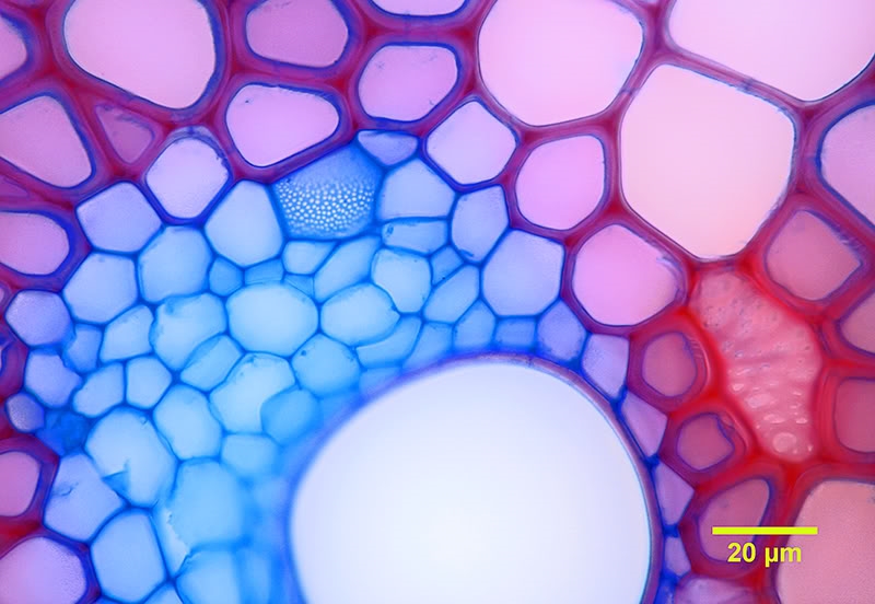 Dazu möchte ich Ihnen gerne zwei Fragen stellen: Haben Sie den Bananenstiel vor dem Schneiden fixiert und eingebettet? Und war der Schnitt aus der freien Hand oder mit einem Handmikrotom?