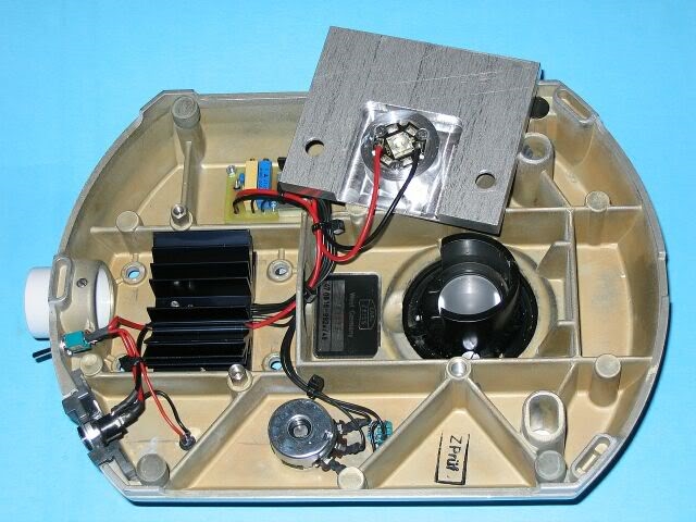 da angesprochen, hier eine LED-Adaption für das Zeiss-Standard, und zwar für das übliche 15 W Rohr. Es handelt sich hier um die brandneue Cree XM, die von LED-Tech als die derzeit effizienteste ihrer Art beworben wird. Vorteil: sehr hohe Helligkeit, ein Chip und der Chip ist relativ groß (3,6 x 3,6 mm2). Nachteil: zumindest bei LED-Tech gibt es sie nur als Modul für die reflow-Löttechnik. Aber mit Mut, technischem Geschick und (altersbedingt) einer Lupenbrille bekommt man es auch mit einem normalen Lötkolben mit dünner Spitze hin.