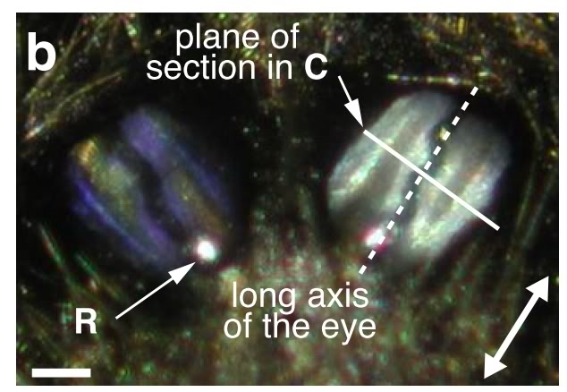 @ Jürgen: Nochmals danke für deinen schönen Schnitt und Beitrag. Ich finde die bei vielen Tieren vorkommenden Hilfsaugen fast noch spannender als die eigentlichen Hauptaugen ! Verbesserte Orientierung im Raum ist die eine Sache, von den Scheitelaugen der Reptilien weiss man auch, dass diese über Detektierung des Tag / Nacht Rhythmus die Verhaltensweisen des Tieres steuern (beim Menschen soll ja die, allerdings doch mehr in die Tiefe des Hirns gewanderte "Zirbeldrüse" [Epiphyse] ein entwicklungsgeschichtliches Residual des Scheitelauges sein ... Florian??).