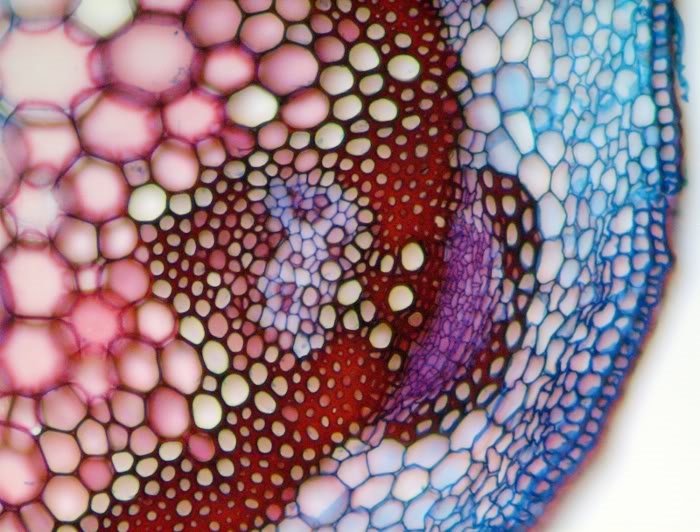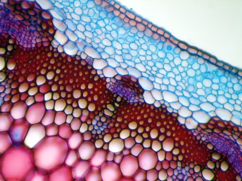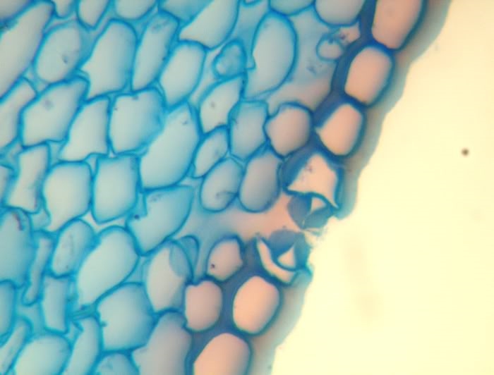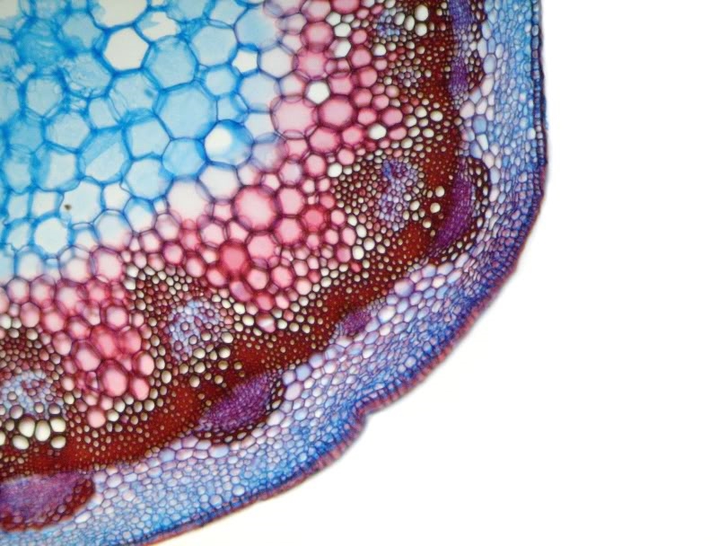 Vielleicht kann ich mit einigen Aufnahmen von Blattstiel in Wacker W3A - Färbung zur Aufklärung beitragen. Ein Sprossquerschnitt ist durch das fehlende Cambium ja ausgeschlossen.