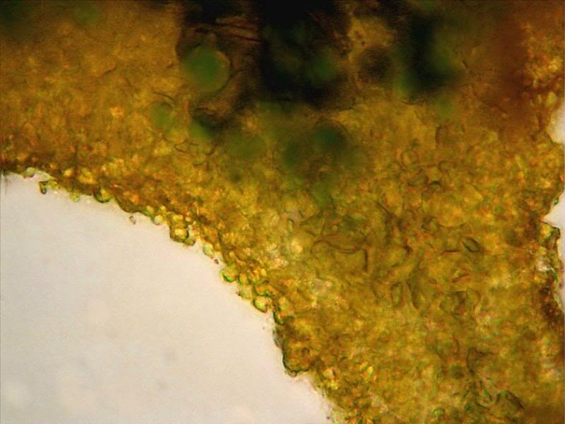 Schnitt kann man dazu nicht sagen, es sind Fetzen geworden. Ich nehme an, die grünen Zellen sind symbiotische Algen. Damit wäre es doch eine Flechte(?) oder ?