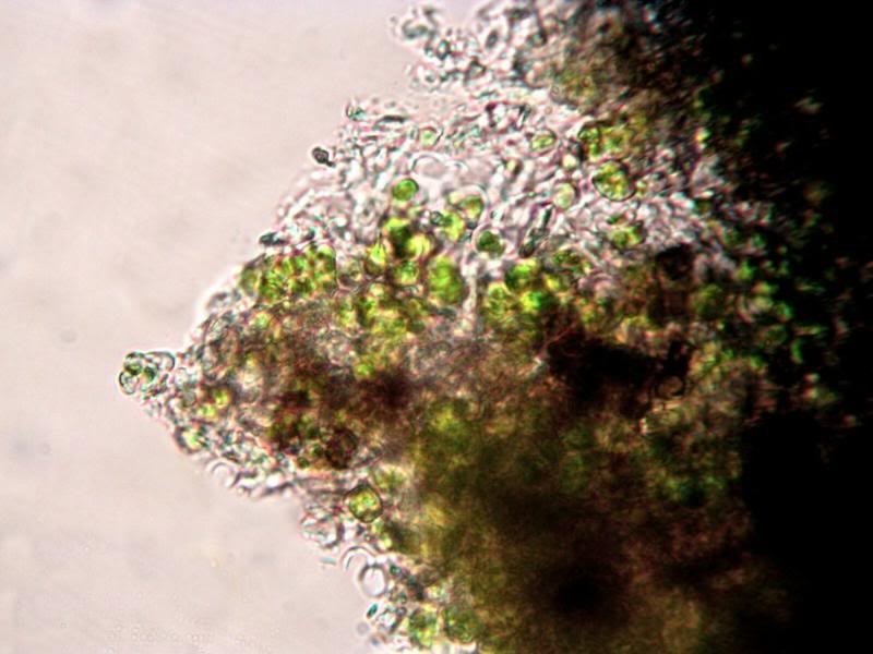 die grünen Zellen sind mit Sicherheit symbiontische Algen und damit hast Du bewiesen, dass es sich bei deinem Fund um eine Flecchte handelt. Fehlt nur noch der Test mit KOH, dann kann man sicher auch die Art bestimmen.