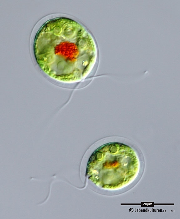 Hier noch ein Beispielbild: die kleinere Blutregenalge hat noch eine weitgehende ovale, natürliche Form, wärend die große Alge schon gedrückt wird und an ihre Außenhülle stößt.