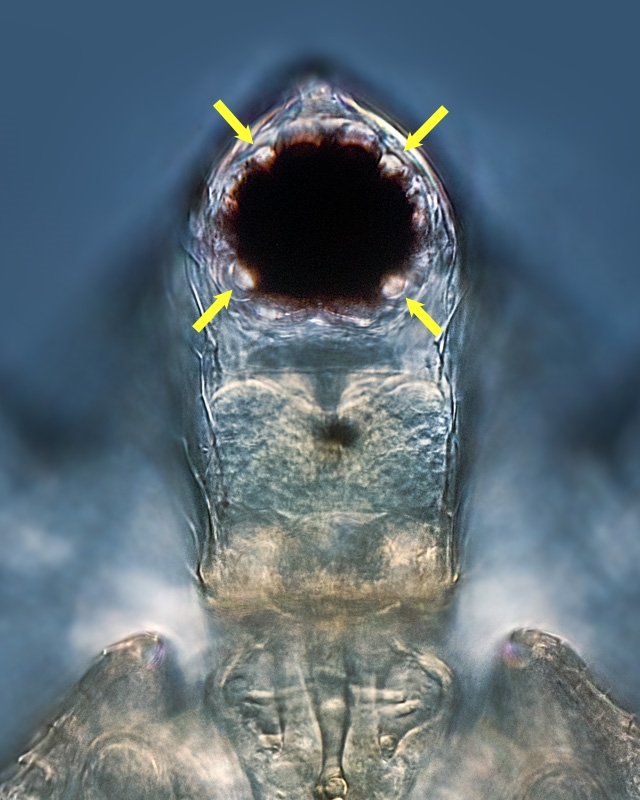 Was die Beiträge zum Sehvermögen von Daphnia angeht, so habe ich ähnliche Fragen und Vermutungen,  wie sie bereits von Manfred Melcher und Jürgen Harst angesprochen wurden. Konkret: die zitternde Bewegung des Komplexauges ist selbst bei schwacher Vergrößerung gut zu beobachten . Hier zwei Bilder, die kurz hintereinander aufgenommen wurden. Sie zeigen in etwa den Winkel, um welchen sich die Augen bei dieser zittrigen Bewegung drehen. (Ich weiß leider nicht, wie man die Bilder als GIF´s animiert. Wer so etwas kann: bitte sehr....). Sie zeigen weiterhin, dass die Komplexaugen von einer Grenzfläche umgeben sind (Membran?):