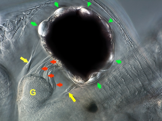 Das Komplexauge in Seitenansicht. Das Auge besitzt mehrere Kristallkörper ("Linsen", grüne Pfeile), die anscheinend in eine Pigmentmasse eingeschlossen sind. Die roten Pfeile weisen auf die Sehnerven, die zum Gehirn (G) gehen Die gelben Pfeile weisen auf einen Teil der Muskelfasern hin, die das Auge bewegen: