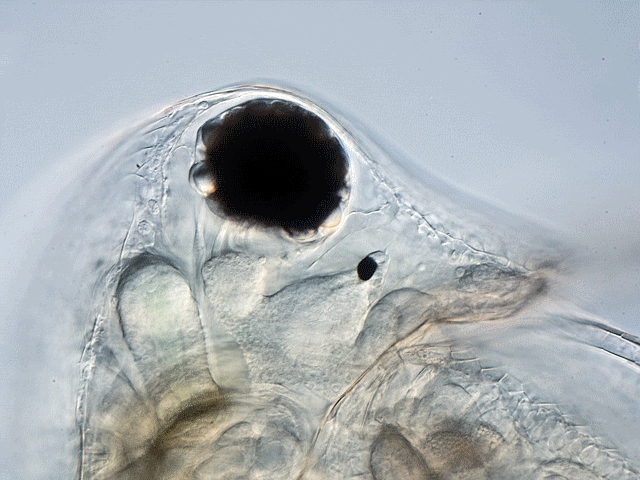 Hier die Frontalansicht einer Daphnia mit Fokus auf das Auge: