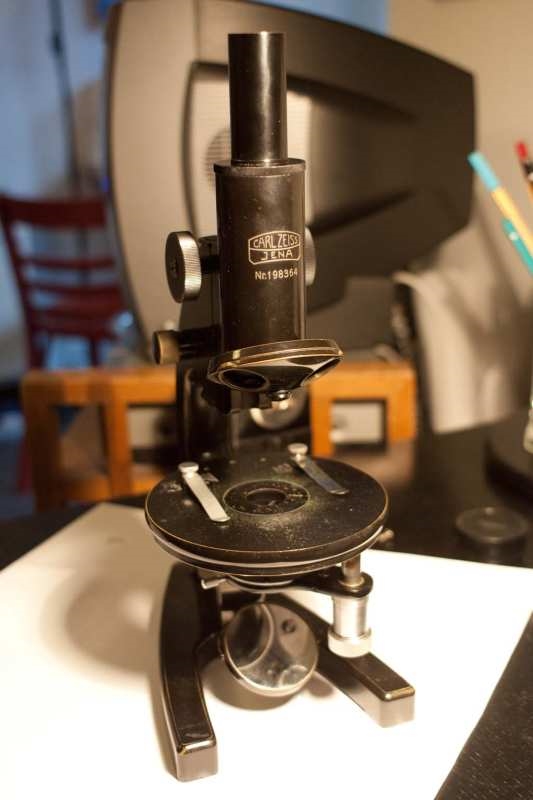 ich habe schon seit langer Zeit dieses Carl Zeiss Jena Stativ E Mikroskop. Leider habe ich erst jetzt den Antrieb mich ernsthaft mit diesem Gerät und der Mikroskopie zu beschäftigen. Laut dem Carl Zeiss Archiv wurde es um 1925 herum gebaut. Ich weiß, dass dieses Mikroskop schon ziemlich alt und nicht unbedingt von hohem monetäeren Wert ist. Aber für den Anfang hoffe ich damit etwas Spass zu haben, also quasi zum anfixen :) . Es hat zwei Okulare (Huygens) mit 10x und 5x Lupenvergrößerung. Die Objektive sind mit A (10 0,85), DD (40 0,85 0,17) und E(60 0,9 0,17) bzeichnet. Ich habe leider nicht herausfinden können wofür die Buchstaben stehen. Ist es einfach nur die alte Bezeichnung von Zeiss Objektiven?