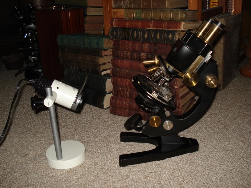 Inwiefern es bei Deinem Mikroskop wirklich erforderlich ist, das Köhlersche Beleuchtungsprinzip exakt einzustellen, weiß ich nicht. Als das Mikroskop gebaut wurde, gab es zwar schon elektrische Leuchten, diese waren aber in den seltensten Fällen ähnlich raffiniert gebaut wie die Ölleuchten aus England, die z.T. Jahrzehnte zuvor gbaut wurden. Es kam zunächst bei den Lampen auf eine helle Birne und eine nachträgliche Blaufärbung des sehr tranig-gelblichen Lichtes an. Wer einmal eine "Schusterkugel" oder eine "Luzifer" im Einsatz erlebt hat, wird verblüfft feststellen, dass man mit diesen recht einfachen Leuchten ganz ordentlich arbeiten kann.