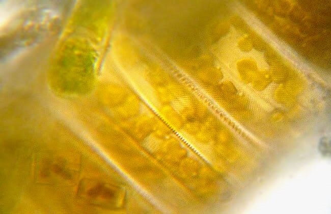 nun habe ich die Alge noch einmal gefunden und sie mit 100x Obj. fotografiert. Um mehr erkennen zu können, müsste ich stacken: