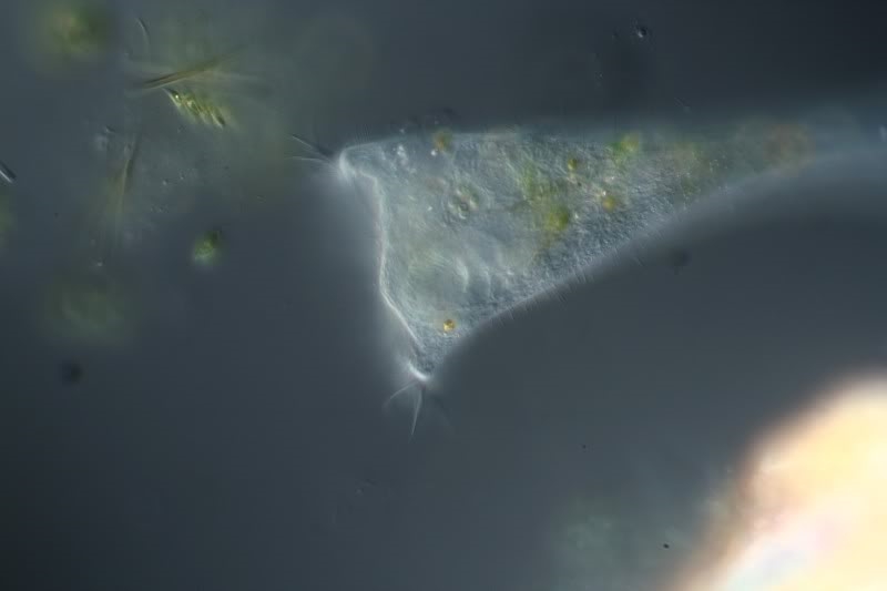 Das Sonnentier ist eine Actinosphaerium, sehr wahrscheinlich Actinosphaerium eichhornii. Mann sieht deutlich dass die Axopodien nicht im Mittelpunkt entspringen, im Gegensatz zu Actinophrys sol.