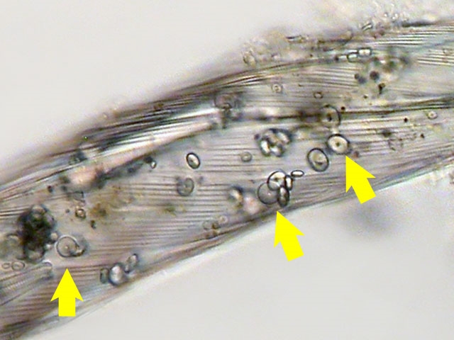 Bei dieser Alge ist es mir immer noch nicht klar, ob die Körnchen Pyrenoide sind. Das würde bei der Entscheidung "Binuclearia" bzw. "Microspora" entscheidend helfen.