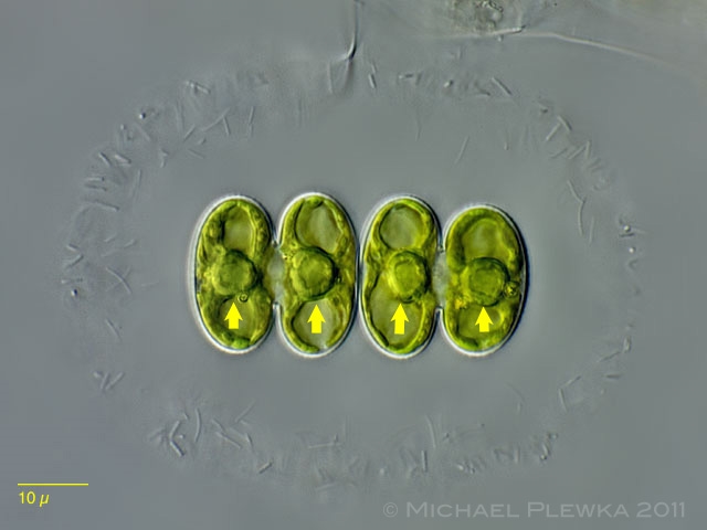 4. Oedogonium sp. (weiße Pfeile: Pyrenoide, gelber Pfeil: Zellkern):