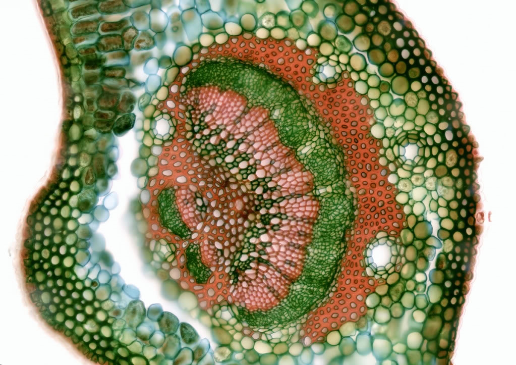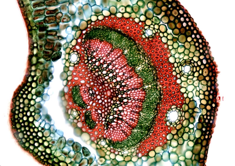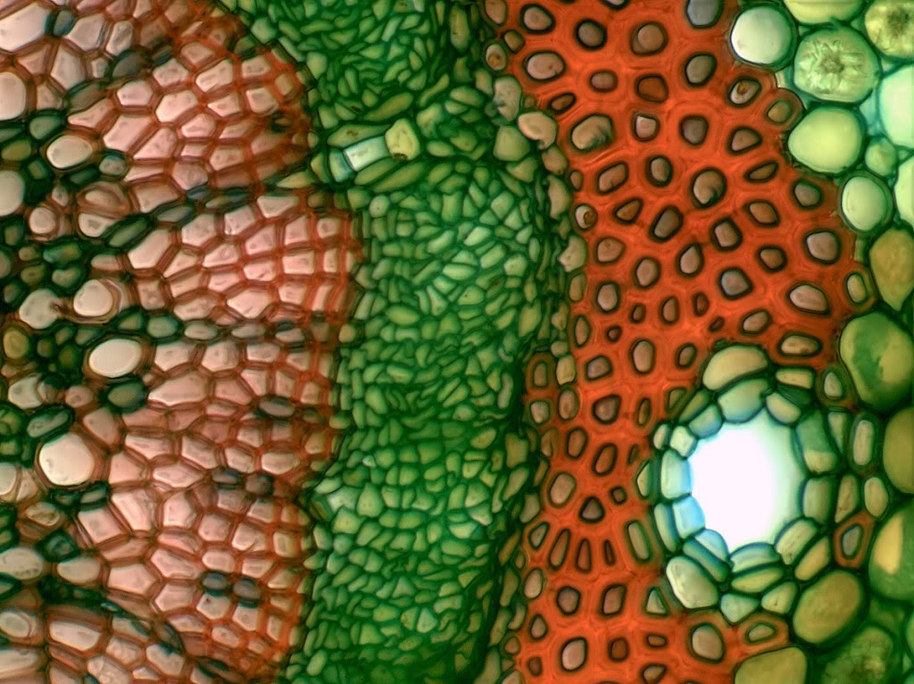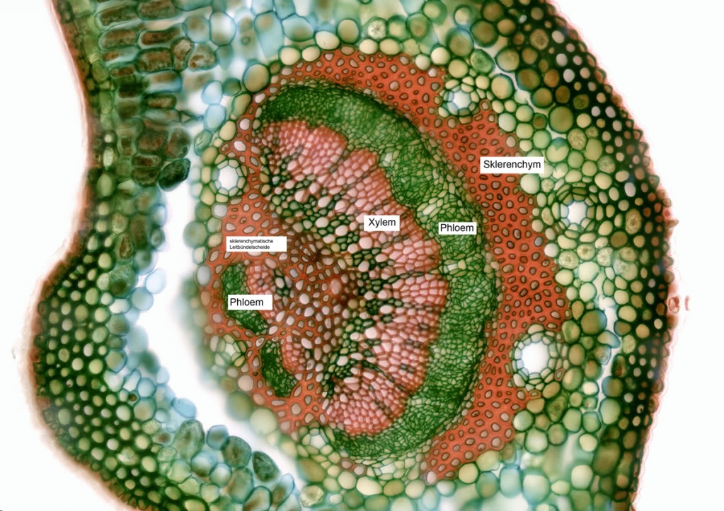 kleine Ergänzung: es handelt sich, so sagen alle Lehrbücher, bei Blättern in der Regel um geschlossene Leitbündel und demnach gibt es kein Kambium und demzufolge kann man auch nicht zwischen primärem und sekundärem Xylem unterscheiden. Dennoch kann auch ich hier im Xylem eine deutliche Differenzierung erkennen - in Proto- und Metaxylem (?). Oder, gibt es doch zeitweilig ein Kambium? Dazu müsste man unterschiedlich alte Blätter untersuchen.