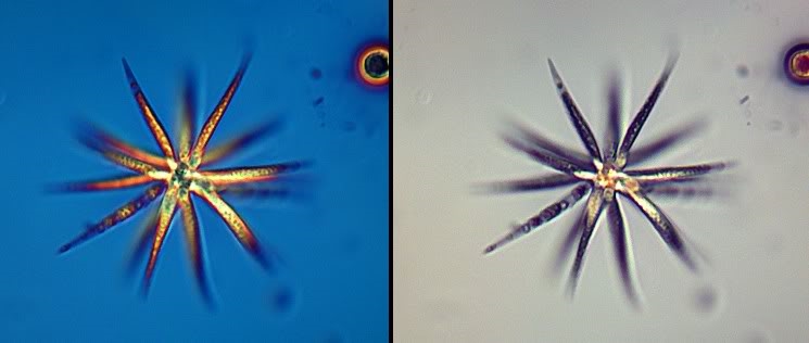 Diatomee sp im Doppelpack (Fragilaria capucina?) bei zwei verschiedenen Einstellungen des Strahlenteilerplättchens
