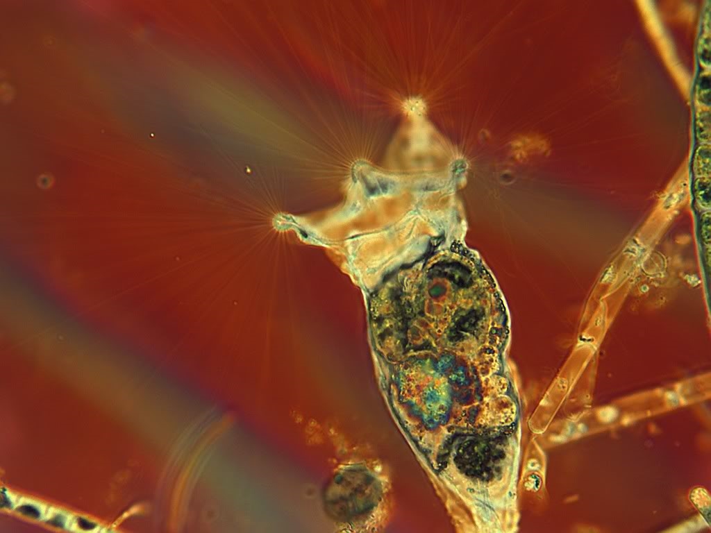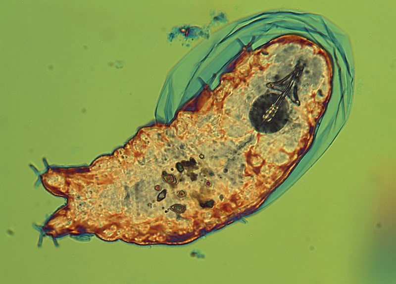 Das andere Bild zeigt ein Bärtierchen das sich offenbar aus seiner Eihülle herausbemüht, interessanterweise ist die Hülle hinten aufgegangen... In dieser Probe waren sehr viele Bärtierchen und auch deren Eier.