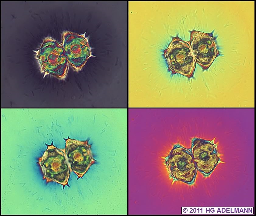 Staurastrum sp, 4 Aufnahmen bei verschiedenen Einstellungen des Strahlenteilerplättchens