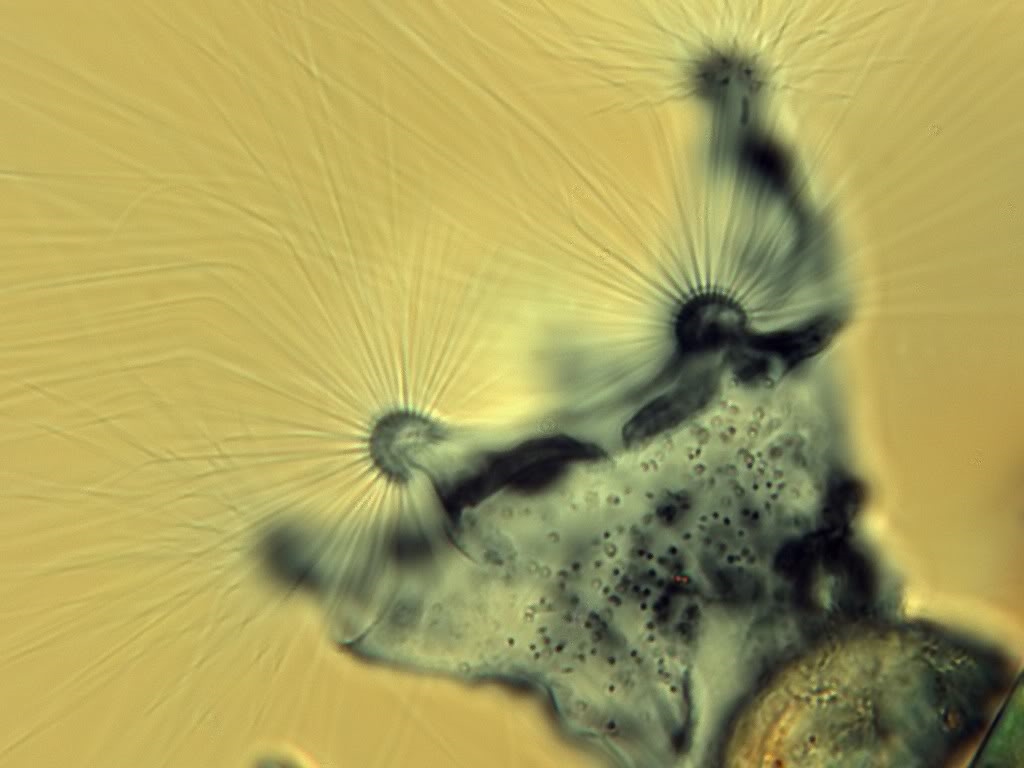 Zwei Bilder zeigen Collotheca ornata und dessen imposanten Fangborstenapparat im Detail.