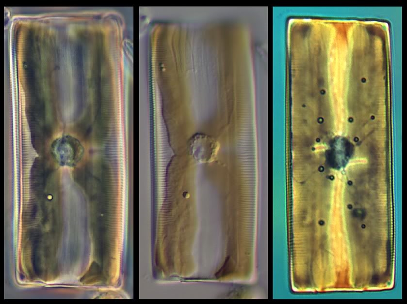 ich habe mal versucht, Phaco, DIC und Interferenzkontrast nach Jamin-Lebedeff (von links nach rechts) zu vergleichen. Das Bild zeigt eine markante Diatomee (wer kann sie bestimmen??).