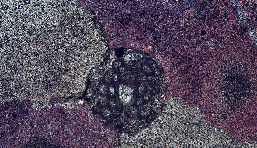 Ich habe in dem Schliff noch Anschnitte aus anderen Ebenen dieser Form gefunden, die ich hier anhänge. In einer bestimmten Ebene ist das Zentrum hohl, die ganze Gestalt kreisrund ohne 'Kleeblätter', in einer anderen Ebene mit deutlicher äusserer Kleeblattform ist das Zentrum fein gekammert ...