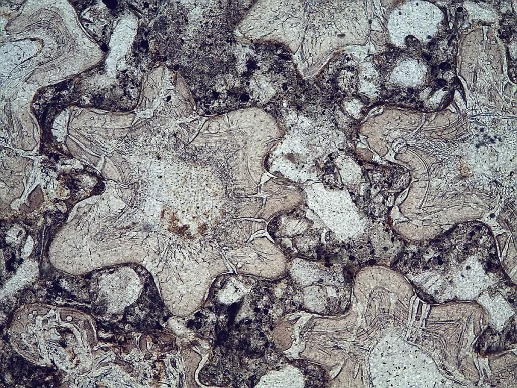 Der Dünnschliff durch eine Knochenplatte von Asterolepis ornata (Oberdevon, Lettland), zeigte überraschenderweise schöne, sternförmige Anordnungen der Knochensegmente.
