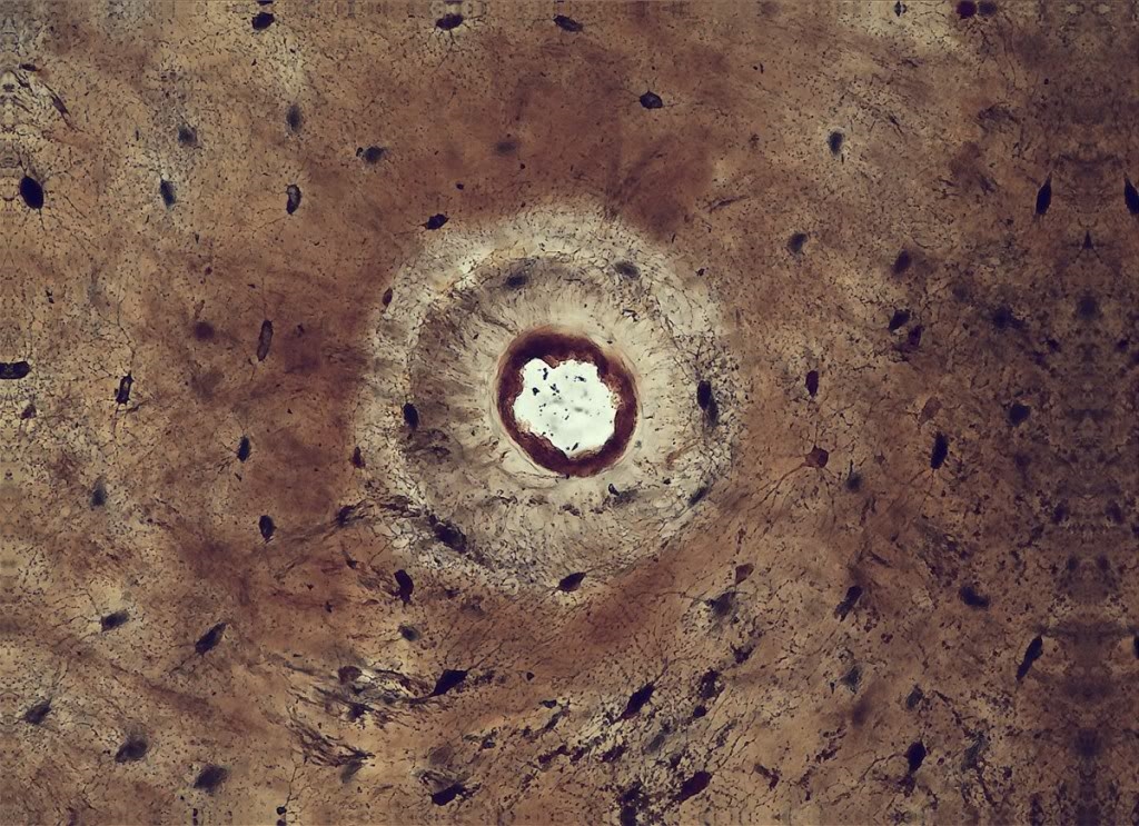 Bild 1 zeigt das Äquivalent zu einem Havers'schen Kanal in dem ein Blutgefäss durch den Knochen zieht. Man sieht deutlich die typischen, konzentrischen Lagen der Knochensubstanz um den Kanal.