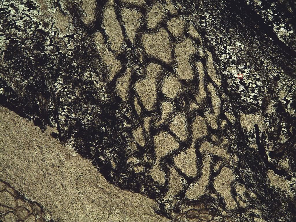 Nachtrag Panzerfisch: Ich habe noch einen Dünnschliff durch eine andere Knochenplatte von Asterolepis ornata (Oberdevon, Lettland), dieser Schliff liegt nicht wie der bisherige an der Oberfläche sondern geht in die Tiefe der Substanz, sozusagen 90 Grad versetzt zur Oberfläche.