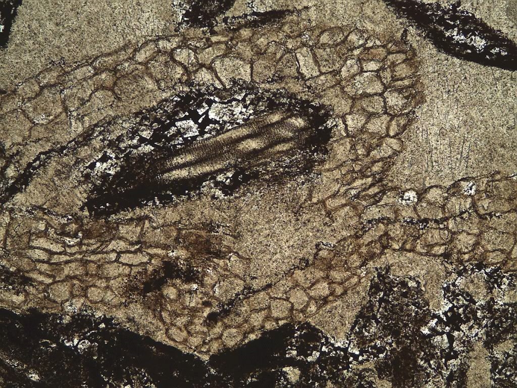 heute kommt die Fortsetzung mit dem Dünnschliff durch einen Torfdolomit, Mittleres Oberkarbon (ca. 305 Mio Jahre), Essen-Borbeck, Flöz Katharina, Zeche Chr. Levin.