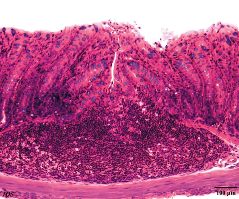vielen Dank für die nachgetragenen Bilder. Hier erscheint mir die Maus noch doch wieder richtig "menschlich"! Die Lymphfollikel der Maus sind in Relation zu den anderen anatomischen Strukturen recht groß und die Muskulatur der Darmwand vergleichsweise schmal, ansonsten für mich ein fast gewohntes Bild.