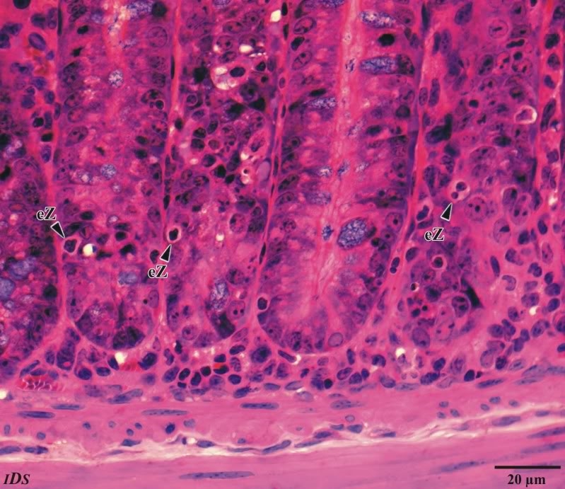Die Darmschleimhaut enthält neben den Enterozyten und den schleimsezernierenden Becherzellen einen weiteren Zelltyp, der durch helle Höfe um die Zellkerne besonders auffällt. Hierbei handelt es sich um sogenannte "Enterochromaffine Zellen" (EC-Zellen), deren Sekrete u. a. für die Regelung der Darmmotilität  verantwortlich sind. In Abbil-