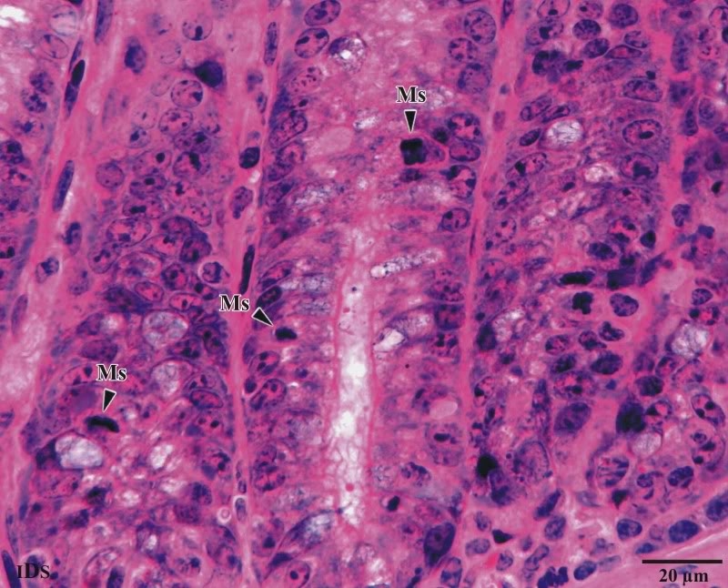 Ein besonderes Merkmal der Darmschleimhaut ist seine hohe Mitoserate. In üblich dicken Paraffinschnitten sind Mitosestadien nur schwer zu erkennen. In Abbildung 3 wurden verschiedene Mitosestadien gekennzeichnet. Bei der Durchsicht derartiger Schnitte lassen sich alle Stadien einer Mitose beobachten.