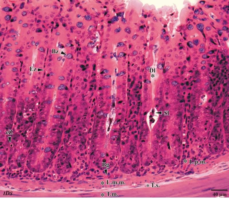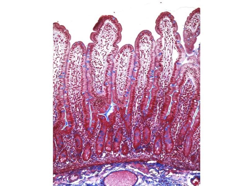 dass bei dieser Vergrößerung Kerckring'sche Falten nicht erkennbar sind, ist klar, aber auch ich vermisse bei Dieters Dünndarm die Zotten. Eigentlich sollte das doch so aussehen (allerdings beim Menschen):