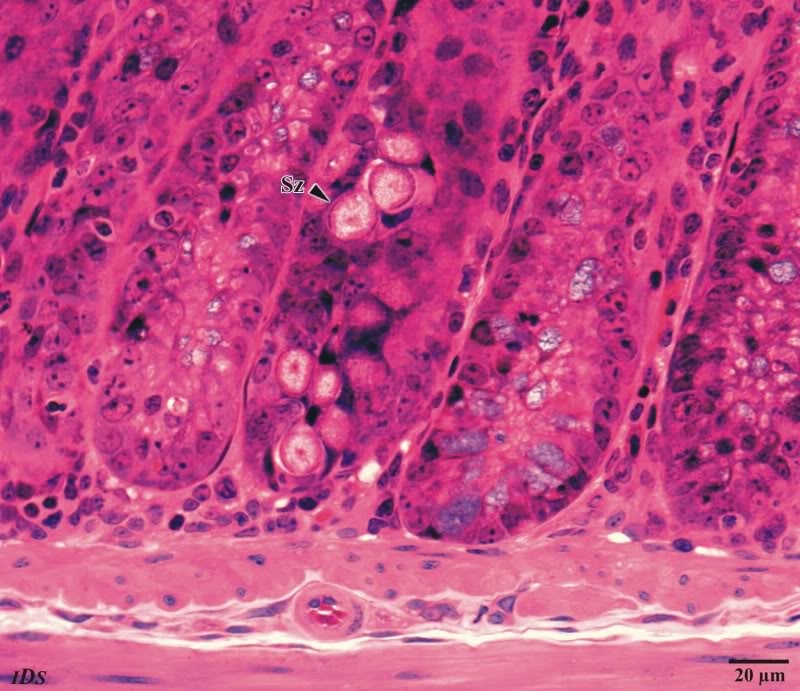 Leider kann ich Dir zur Zeit nicht mehr zu den Sporozoen sagen, als ich bereits oben geschrieben habe. Ich habe diese Parasiten schon mehrfach in Därmen von Mäusen nachweisen können. Auch sind unterschiedliche Entwicklungsstadien vorhanden. Ich vermute, dass es sich bei meinen Zysten um einen männlichen Mikro-Gamonten handelt, aber für eine sichere Beurteilung fehlt mir die entsprechenden Kenntnis und vor allem die nötige Erfahrung.