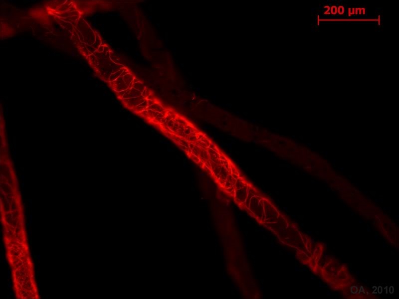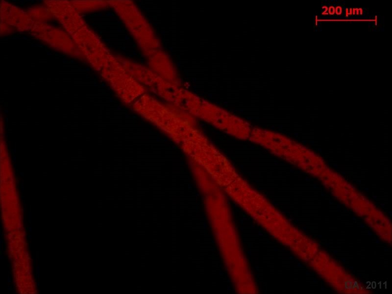 und hier mein Beitrag zur Kombination von Auflichtfluoreszenz mit Phasenkontrast im Durchlicht. Der grüne Hintergrund kommt vom Grünfilter im Durchlicht.