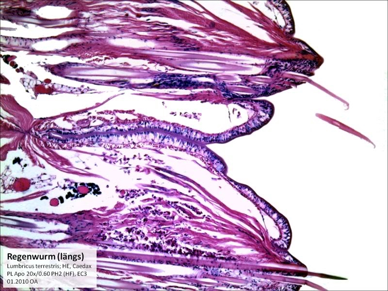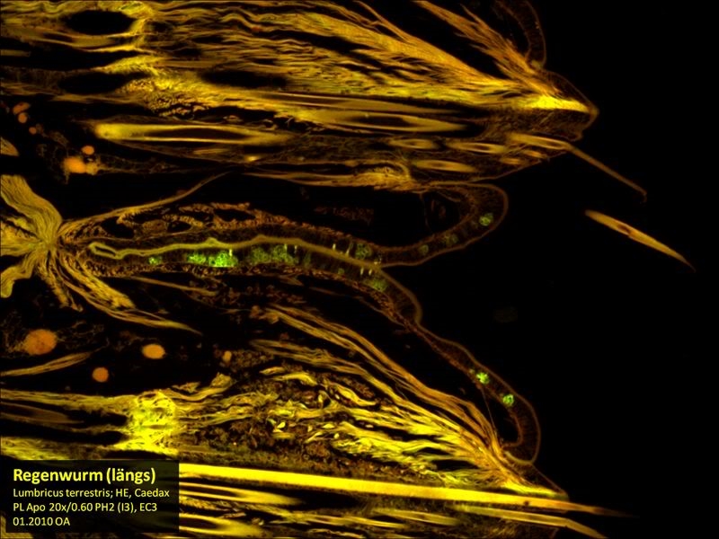 Rolf hatte weiter oben um eine Aufnahme eines HE-Präparates gebeten. Anbei ein Präparat des Regenwurms (Präparat von G. Rosenfeldt), HE-gefärbt, einmal im Hellfeld und einmal in der Fluoreszenz. Interessanterweise zeigen die Fluoreszenzaufnahmen einige Details (grünlich dargestellt), die bei der HE-Färbung nicht dargestellt werden. Es könnte sich hierbei um Schleim o.ä. handeln.