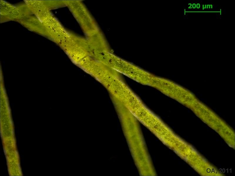 3) Eine AFL-Aufnahme bei Grünanregung (BP 515 – 560nm, 580nm, LP 590nm). Hier fluoreszieren offenbar Cyanobakterien, das Chlorophyll der Algen wird hingegen kaum angeregt.