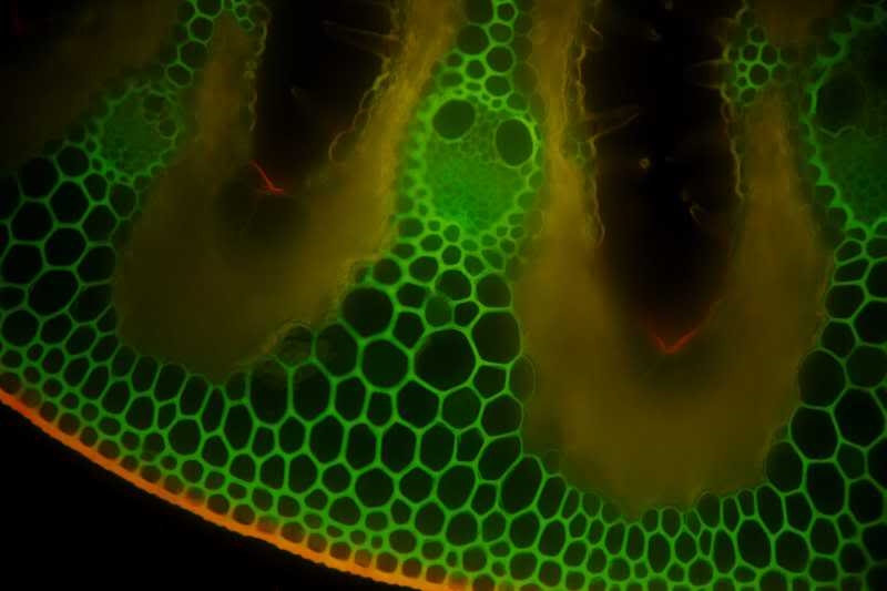 Die drei 'Wacker-Farben', für sich getrennt eigesetzt, zeigen in der AL-Fluo interessante Modifikationen des Themas 'Blattquerschnitt eines borealen Grases'.