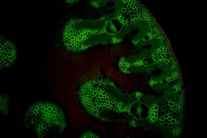 Die Al-Fluo setzt mit grün fluoreszierenden Haaren, rot-bräunlich erscheinenden bullösen Zellen,