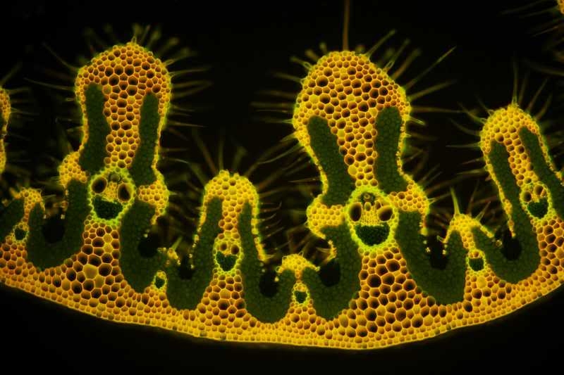 Im DL fallen ebenfalls die noch mit Luft gefüllten Haare auf, das Xylem und das Phloem sind farblich abgesetzt, ebenso das Assimilationsparenchym. Die restlichen Gewebe erscheinen einheitlich gelb.