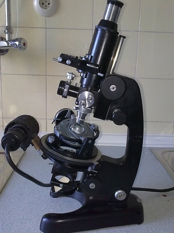 beide Mikroskope sind voll funktionsfähig, das rechts im Bild gehört der Sammlung des Mineralogischen Museums in Freiberg,  das links gehört mir. Ich benutze es nicht - es steht in der Vitrine und ist eines meiner besten Stücke  :) :). Zum täglichen Gebrauch habe ich ein Orthoplan-Pol  und ein Ortholux-II-Pol, beides phantastische und universelle Pol-Stative, aber eher funktionell als wirklich schön.