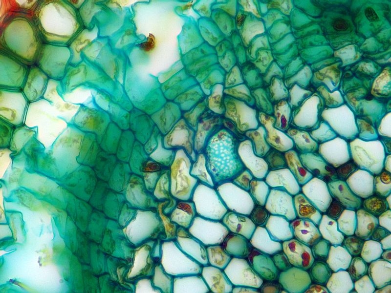 3. Die "Mutante": das ist m.E. eine Zelle, die gerade dabei ist, sich zu einer Trachee zu entwickeln. Sie lebt also noch und würde, wenn du sie nicht gemeuchelt hättest, jetzt die Zellwände lignifizieren und dann absterben. Interzellulargänge gibt es meines Wissens nur bei Monocots.