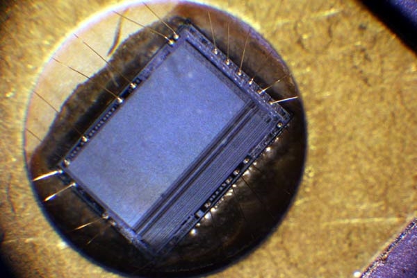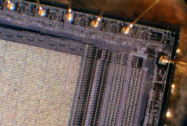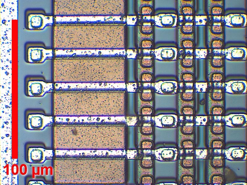 Ausschnitt von einem alten EPROM. Aufnahme mit Objektiv ULWD MSPlan 50/0,55 (unendlich) am BH2-UMA Auflichtkondensor mit Poleinrichtung (Olympus) und Fotoadapter 0,64x auf 5 MPixel Kamera.