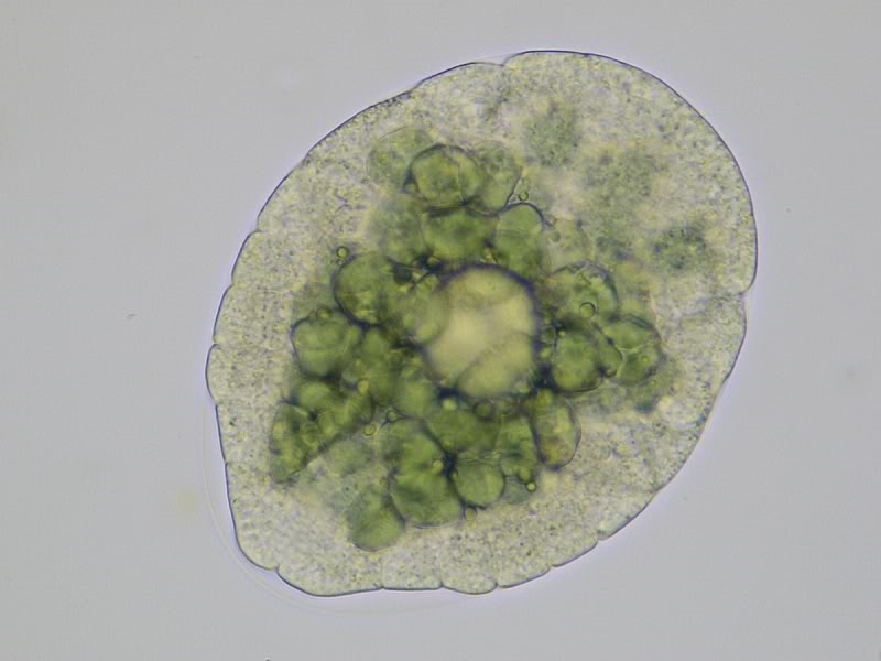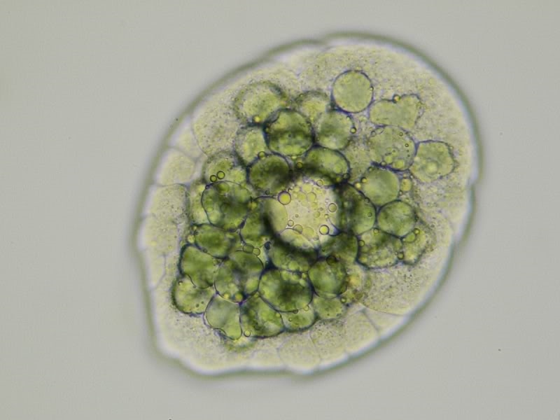 Bild 1 zeigt m.E. ein frühes Furchungsstadium eine Crustaceen- Eies, aus dem sich normalerweise eine Nauplius-Larve entwickelt (Copepode). Kann aber auch aus eine zerquetschten Wasserfloh stammen (Phyllopode) und würde dann ebenfalls ein frühes Entwicklungsstadium darstellen.  Die grünlichen Kugeln stellen wahrscheinlich Dottermasse dar.