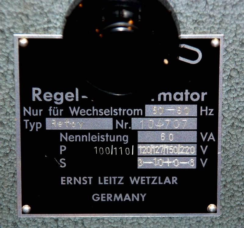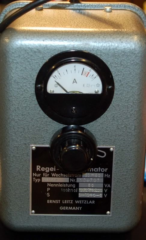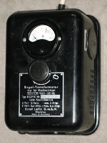 dieser Trafo (spätere Bezeichnung REDYX ) wurde von Leitz in zeitlicher Folge in verschiedenen Varianten gebaut. Die neuere Version hat nur einen Drehknopf für Netz ein-aus und für die Sekundärspannung 2 bis 10 V, 6A. Mit diesem Ausgang wurden damals ausschließlich die weitverbreiteten Kugellampen 6V 5A gespeist. Und mit dem Drehknopf konnte man die Helligkeit dieser Lampen regeln. Mit zuviel Strom gingen die Lampen schnell kaputt, deshalb beginnt der kritische (rote) Bereich auf dem Amperemeter bei 5 A. Außerdem gab es die gleichen Frühausfälle, wenn man bei der Einstellung >5 A den Netzschalter einschaltete.