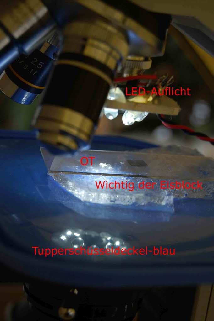 Hier ein erstes Bild vom Aufbau, wie ich mikroskopiert habe. Für alle, die das auch machen wollen, bei denen Lackabdruckpräparate aber nicht funktionieren ???