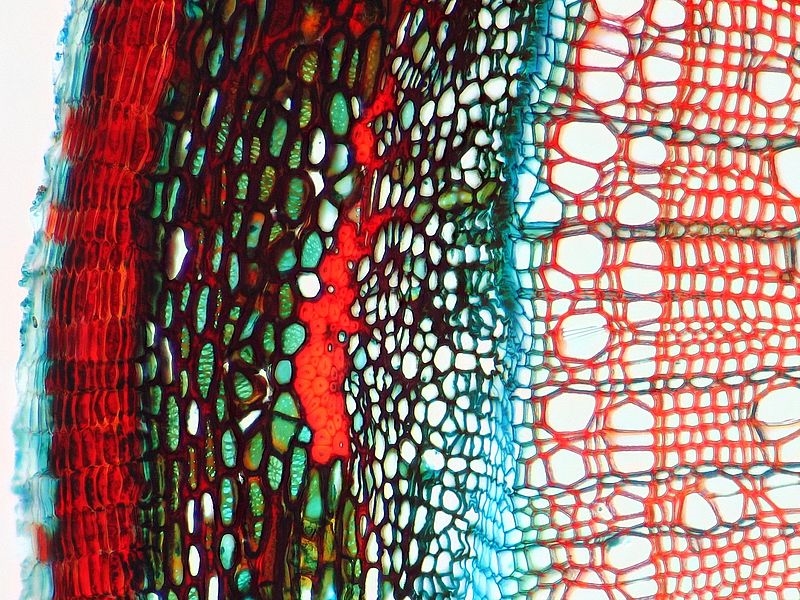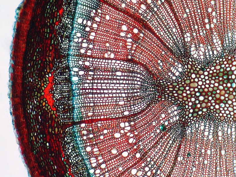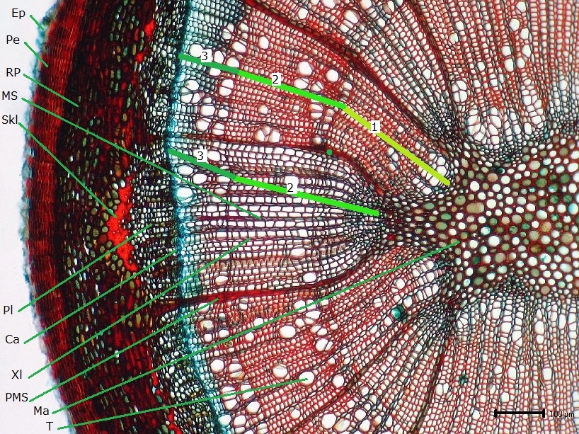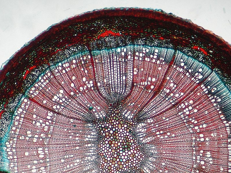Schön zu sehen ist der Aufbau von der Epidermis über Phellem und Rindenparenchym mit eingelagertem Sklerenchymnest zum Phloem. Darauf folgen die backsteinförmigen Cambiumzellen und schließlich das Xylem mit Markstrahlen und Tracheen.