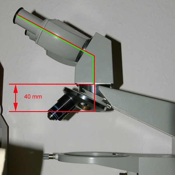 Die rote Linie, beginnend bei der Objektivanlagefläche und endend an der Okularanlagefläche, zeigt die optisch/mechanische Tubuslänge von 160 mm. Davon sind 40 mm abzuziehen (gemessene Distanz zwischen Objektivanlagefläche und Anlagefläche vom Prisma/Ringschwalbe), es ergibt sich die grüne Linie = optisch/mechanisch wirksame Länge von Prisma plus Bino, in diesem Fall 120 mm.