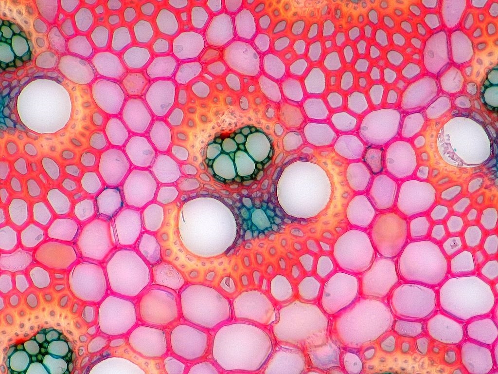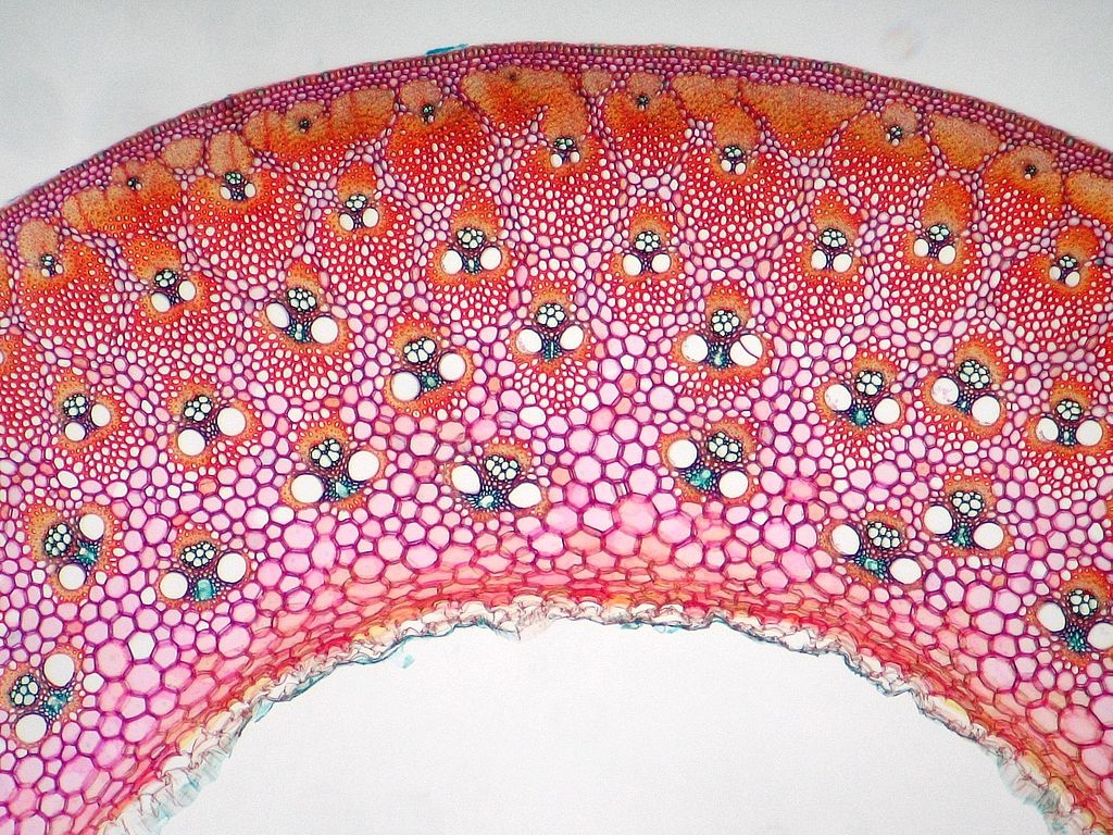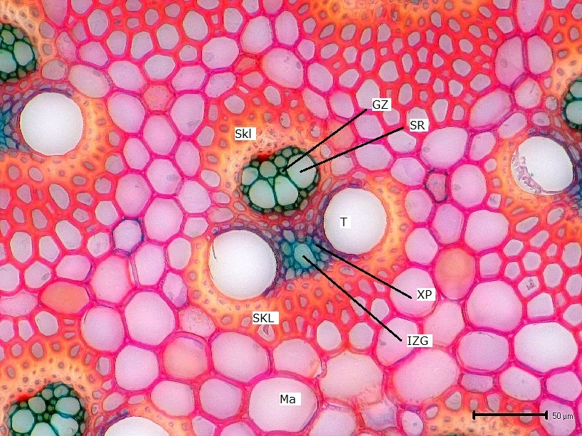 An der Rotfärbung kann man schön erkennen, dass die einzelnen Leitbündel mit ihren Sklerenchymkappen in einem ebenfalls lignifizierten Mark liegen. Dies ist der Grund für die große Härte und Stabilität der Bambushalme.