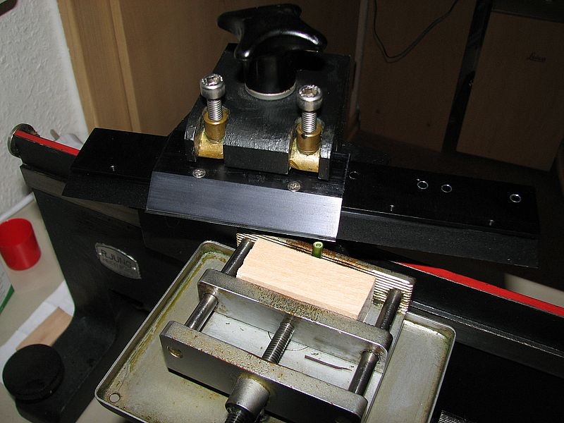 Der Klingenhalter gerät beim Schneiden des frischen Bambushalms etwas ins Schwinge, was sich durch eine langsamere Schlittenführung etwas eindämmen lässt.
